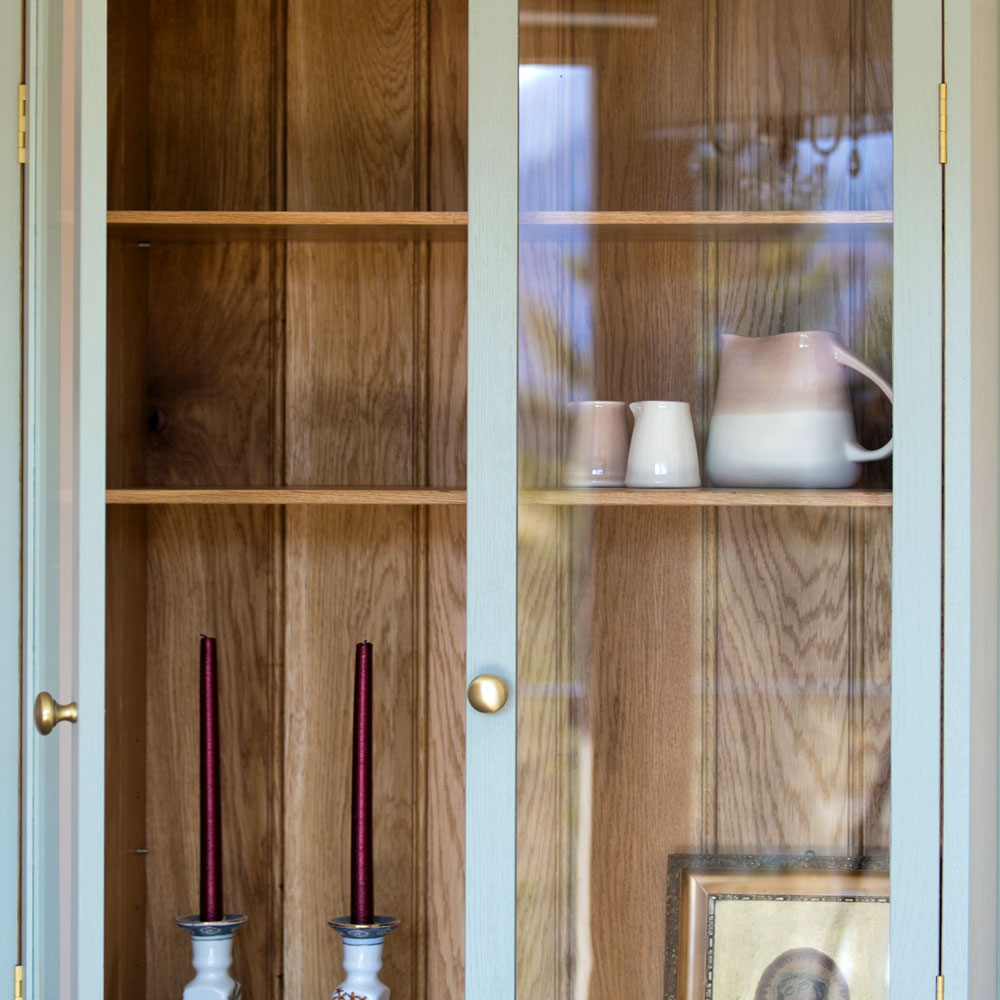 Jemná modro sivá farba sekretára Erita pracuje v harmónii s teplou medovou farbou dubového dreva, zataľ čo zamatovo zlaté úchytky a vlnkové ukončenie šuflíka dodávajú určitý pôvab tomuto sekretáru. Erita je výstavný sekretár, ktorý sa bude vynímať v kuchyni u novej majiteľky. Mz sme nesmierne nadšení, že sme mohli vytvoriť priestor pre jej drahocennú kolekciu kryštálových váz, pohárov a porcelánových misiek. Veríme, že sa Erita stane skvostom jej novej kuchyne a prinesie potešenie každý deň.